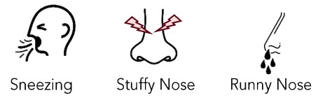 Symptoms of allergy commonly include itchy nose, sneezing, stuffy nose and runny nose.