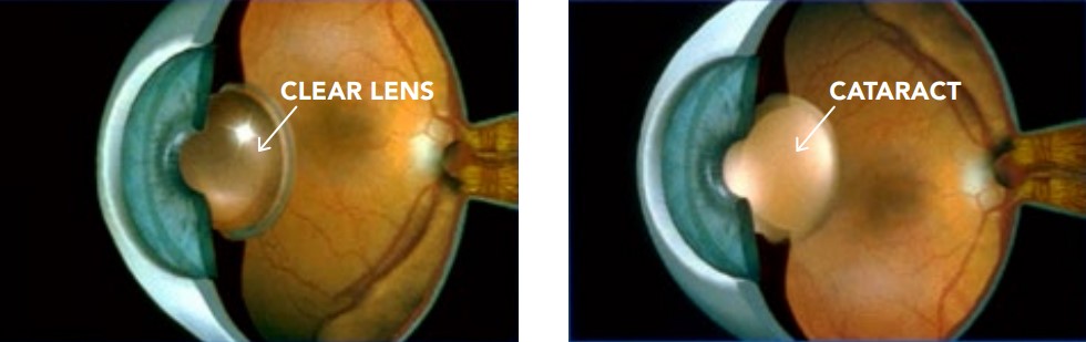 A cataract is the clouding of the lens of the eye. The lens is naturally transparent and focuses incoming light rays to form a sharp, distinct image on the retina. This is similar to the way a camera lens focuses images onto film. A cataract is like a cloudy camera lens. It blocks light rays from entering the eye, resulting in blurred vision.