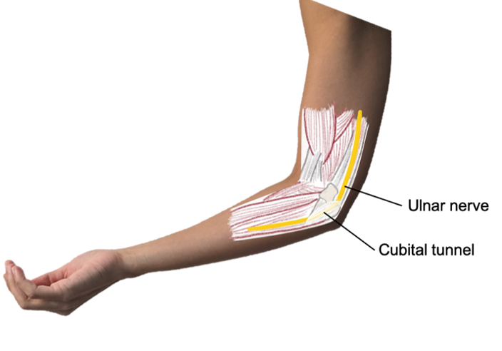 The cubital tunnel is an area on the inner elbow where the ulnar nerve passes. The ulnar nerve provides sensation to the ring and little fingers and coordinates fine motor control in the hand.