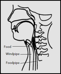 The throat is separated into 2 openings at the lower end: the trachea/airway (below the voice box) and the oesophagus/foodpipe. When the food is pushed to enter the foodpipe, a flap-like structure called the epiglottis, covers the airway to prevent any leakage into the lungs.