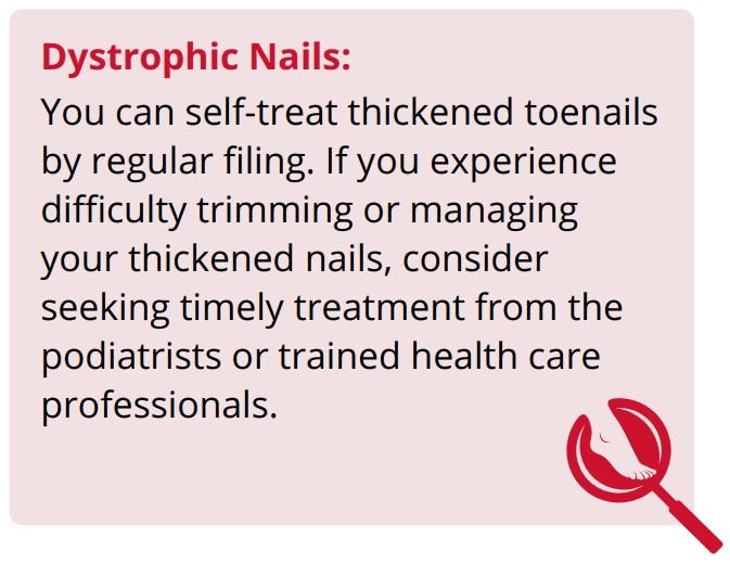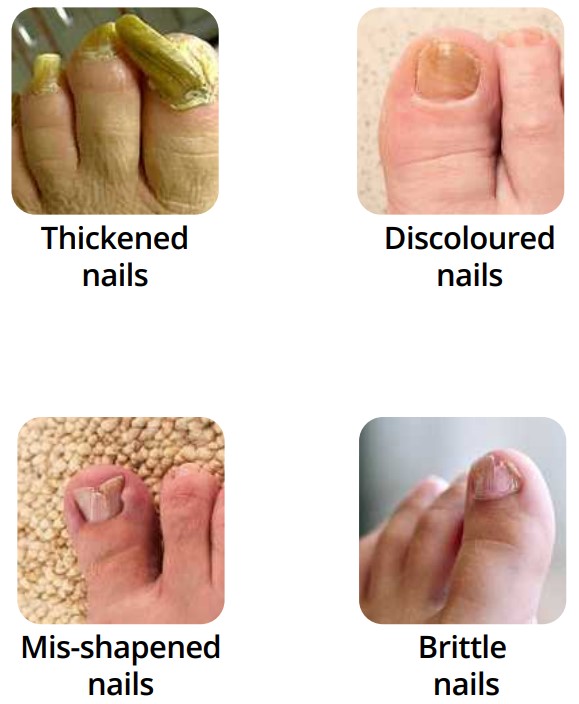 Dystrophic nails are toenails that are deformed, thickened and/or discoloured.