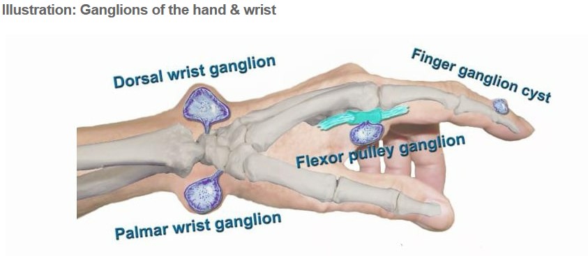A ganglion cyst is a harmless fluid-filled lump that is usually found near the joints or tendons. It is the most common lump in the hand and wrist. It is most often seen on the back of the wrist, but may also develop on the front of the wrist, and on the hands and fingers.