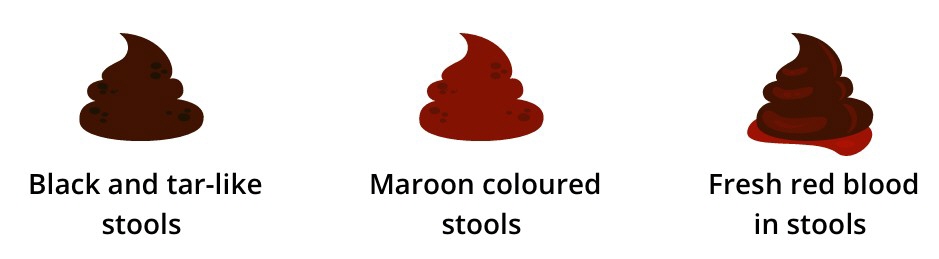 The colour of faeces may determine the site and extent of bleed. The following nature of faeces may suggest GI bleed: