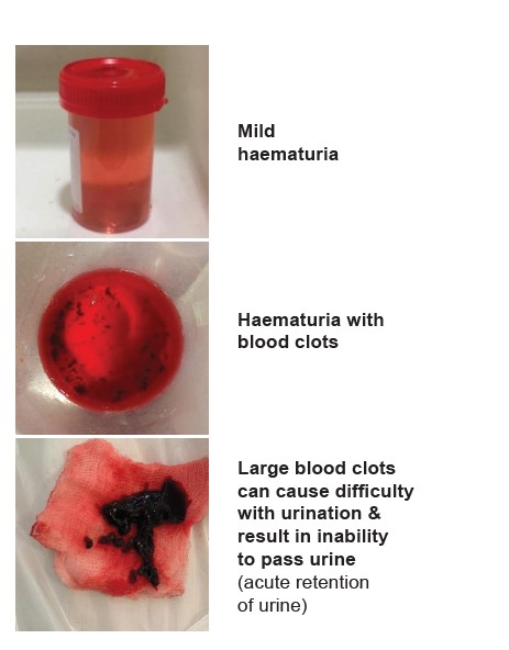 Visible (gross/frank) haematuria is when your urine appears red. This is a more worrisome condition than non-visible haematuria as there is an associated risk of cancer within the urinary tract in up to a third of those affected.