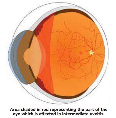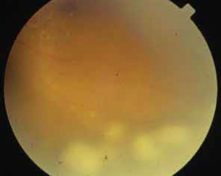 Image showing inflammatory products (exudates) in pars plana region of eye.
