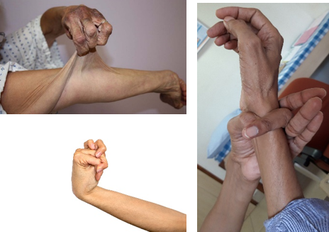 Left (top and bottom): Thin, stretchy skin and hypermobile joints due to Ehlers-Danlos syndrome; Right: Hypermobile long fingers in a patient with Marfan's syndrome able to wrap around opposite wrist. Photos retrived from British Medical Journal.