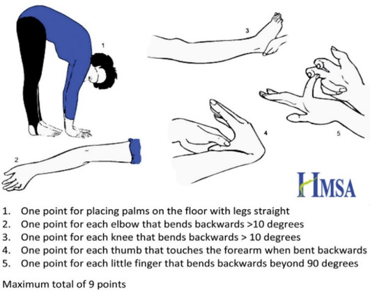 Beighton's score. Photo retrieved from Hypermobility Syndromes Association.