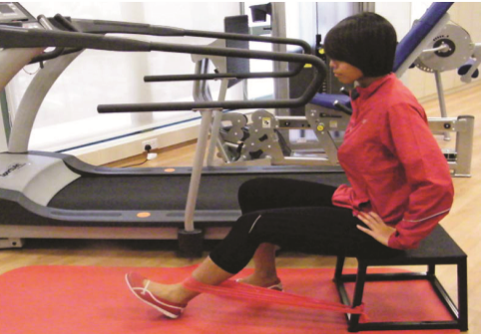 Sit on a chair and place the resistance band around your ankle. Push your leg slowly upwards (by straightening it) and keep your thigh muscles tight.