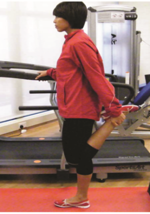 With one hand, grasp your ankle and pull the heel toward your buttocks. Keep your knees close together.
