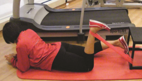 Place band around your ankle and lie down on your stomach. Slowly bring your heel toward your buttocks.