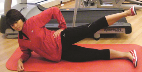 Tighten the front of your thigh muscles and lift this leg away from the other leg while keeping it straight.