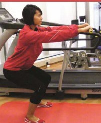 Lower your buttocks toward the floor until your thighs are almost parallel to the ground. This can be done with your back against the wall too.