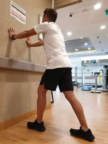 - Slowly lean into the wall until you feel a stretch in the back of the calf.