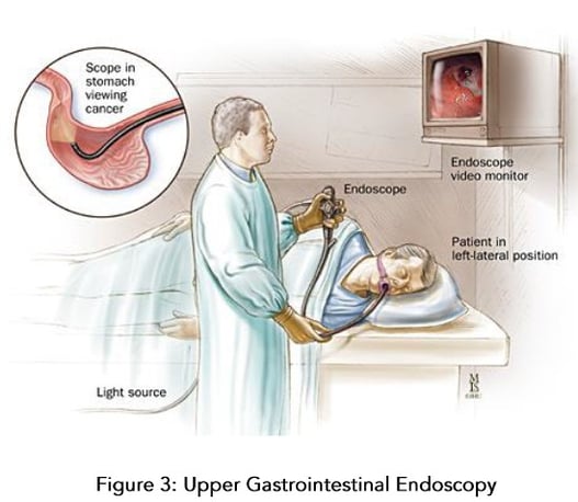 - Upper Gastrointestinal Endoscopy: Examination of the upper gastrointestinal tract (including oesophagus, stomach and part of small intestine) using a long, thin flexible tube with camera and light. This is to view the stomach lining and remove some cells or tissues to detect cancer.