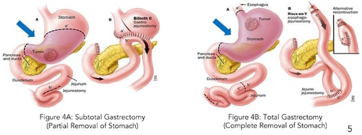 - Gastrectomy: Gastrectomy is a surgical procedure where all or part of the stomach is removed. It is the fundamental part of treatment to achieve cure in early stomach cancer. Nearby lymph nodes are also removed as part of tumour clearance. The remaining parts of the stomach or oesophagus will then be joined back to the small intestine to reconstruct the rest of the digestive tract. Surgery can be done laparoscopically (keyhole approach) in cases of early stomach cancer. Traditional open approach (non-keyhole) can be chosen in the case of advanced stage stomach cancer.