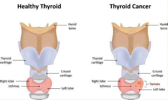 Thyroid cancer is a cancer that starts in the thyroid gland. The thyroid gland sits in the lower middle portion of the neck and consists of a right and left lobe.