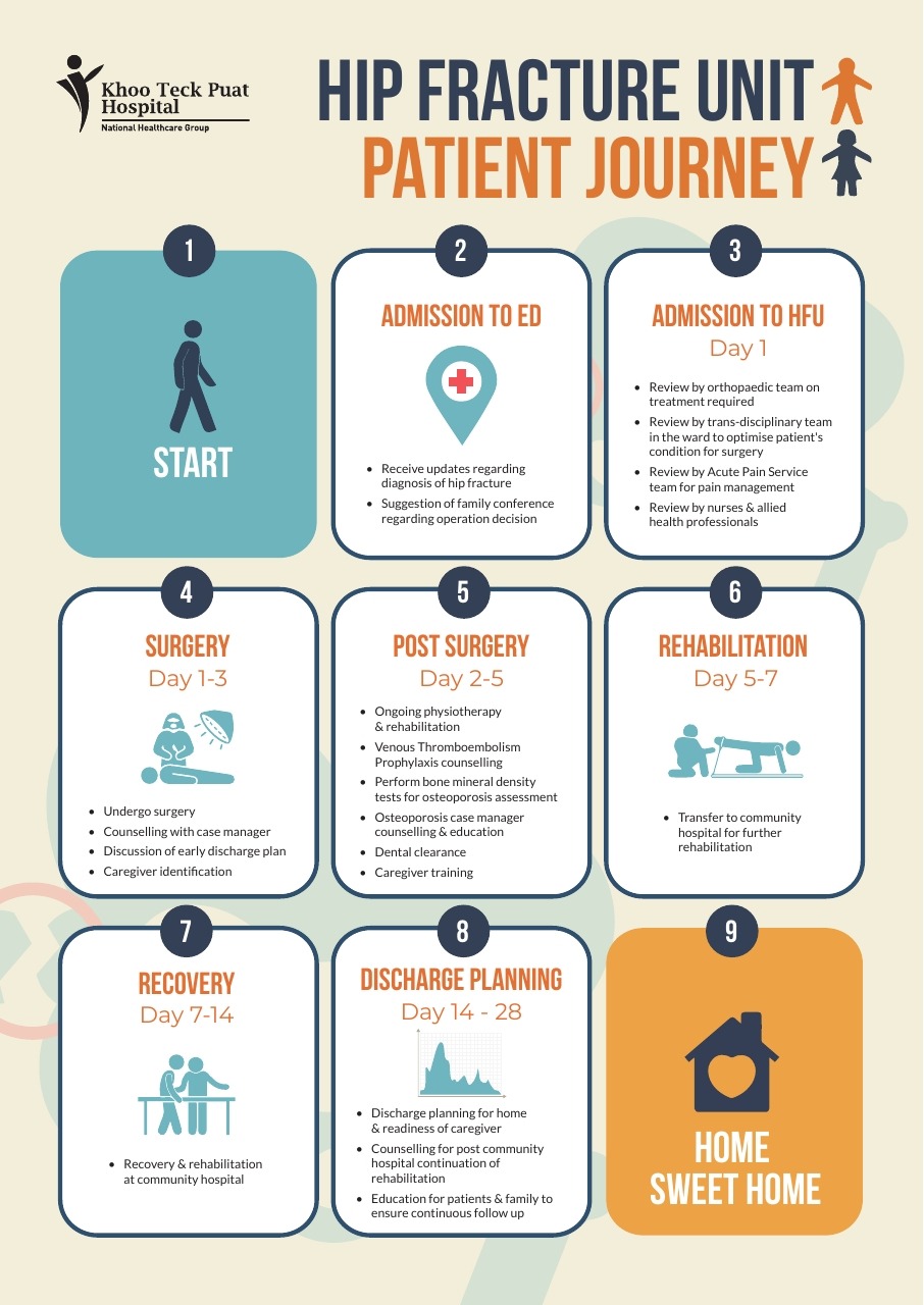 KTPH’s Hip Fracture Service (HFS) provides holistic care for hip fracture patients above 60 years old, starting from the emergency department (ED), going through acute care services including surgery, post-operative rehabilitation and preventive care.