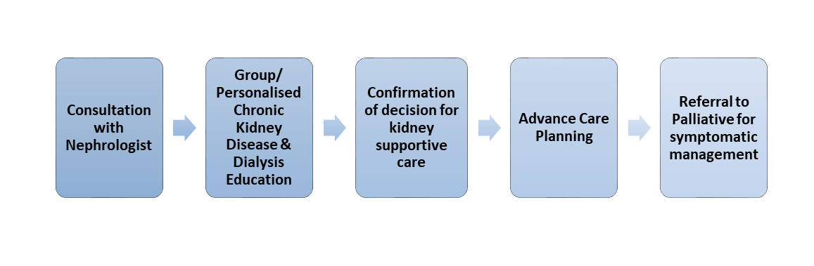 Kidney supportive care is available for patients who opt for symptomatic relief in the management of end stage kidney disease or dialysis withdrawal. We collaborate with the palliative department in the management of patients with end-stage kidney disease opting for kidney supportive care. Advance Care Planning is also available for patients opting for kidney supportive care.