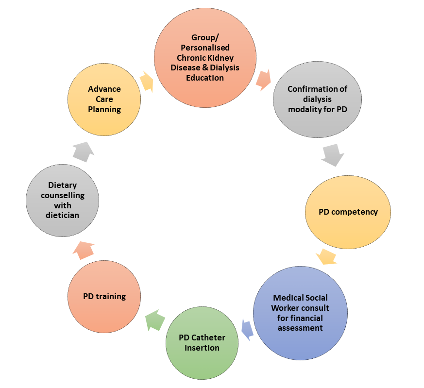 - A comprehensive programme to support patients opting for peritoneal dialysis catheter, from insertion of peritoneal dialysis catheter by our nephrologist or urologist, to regular clinical reviews for chronic PD outpatients