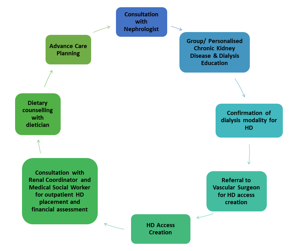 The care of patients with advanced chronic renal failure is managed very closely with nephrologists, renal coordinators, medical social workers, dieticians and Voluntary Welfare organisations such as National Kidney Foundation (NKF) and Kidney Dialysis Foundation (KDF), to prepare patients who are approaching end-stage kidney disease.