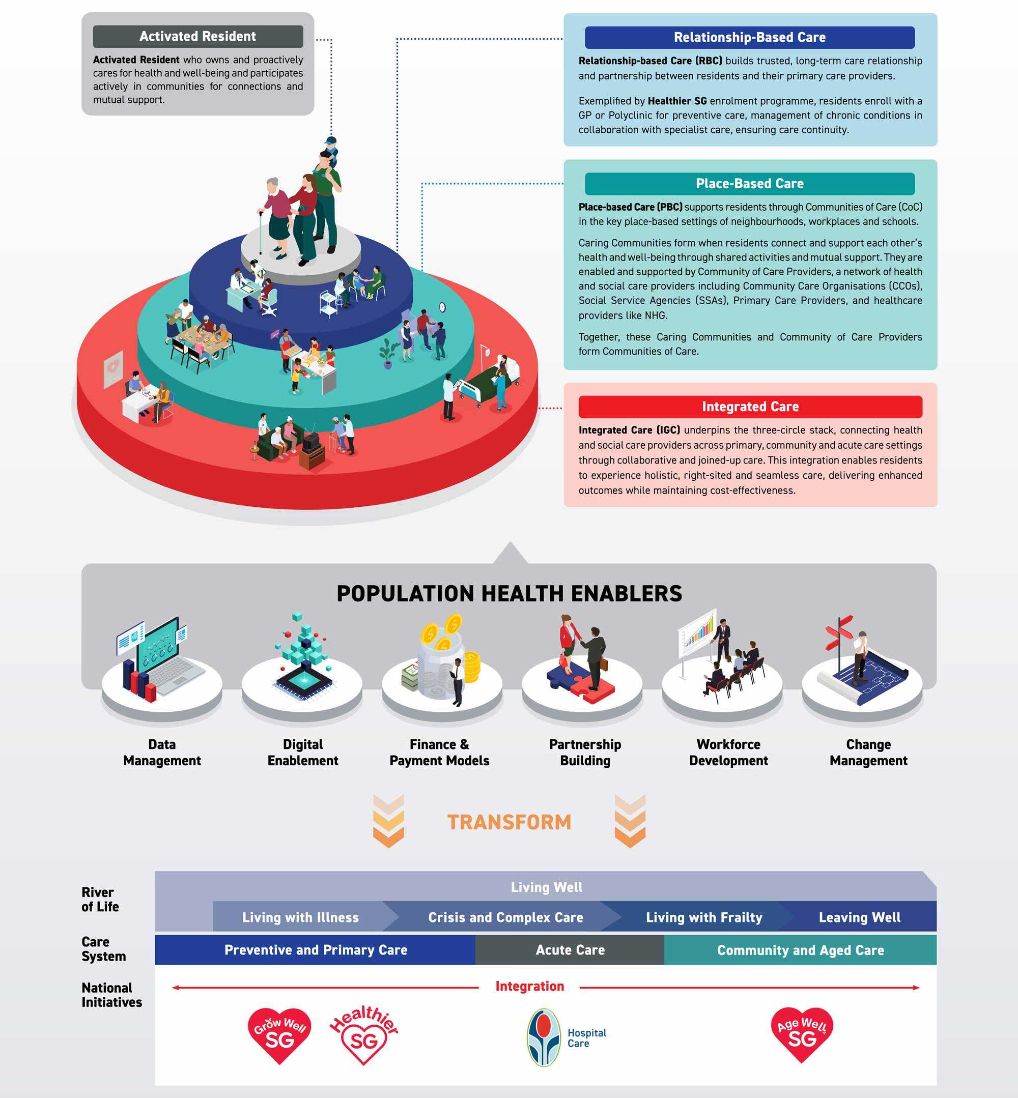 Transforming care and lives of our residents along their river of life from living well to leaving well with our population health stack and enablers, as we reinvent the preventive care and aged care systems, joined up care with acute care, in support of national initiatives.