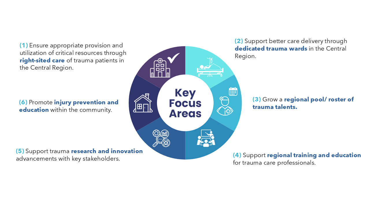 The Central Region (Singapore) Trauma Committee is instrumental in facilitating the development of comprehensive trauma care delivery within the Central Region of Singapore. Through shared accountability, the Committee aims to implement system improvements amongst the member institutions. The goals of the Committee support an effective, sustainable, and inclusive regionalized trauma care system in the Central Region.