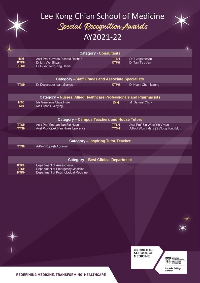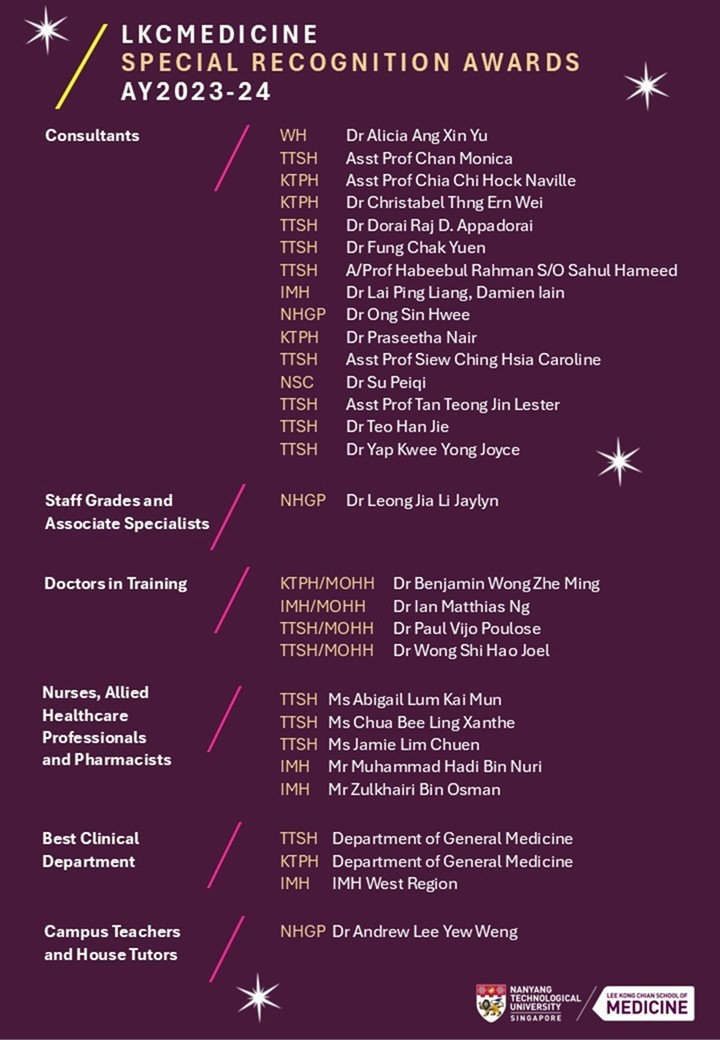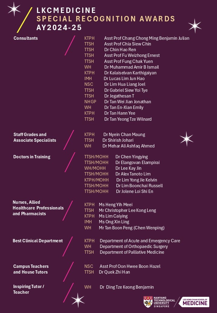 The Nanyang Technological University Lee Kong Chian School of Medicine Special Recognition Award recognises medical clinicians and departments that have made outstanding contributions in teaching, research supervision and supporting the student experience.