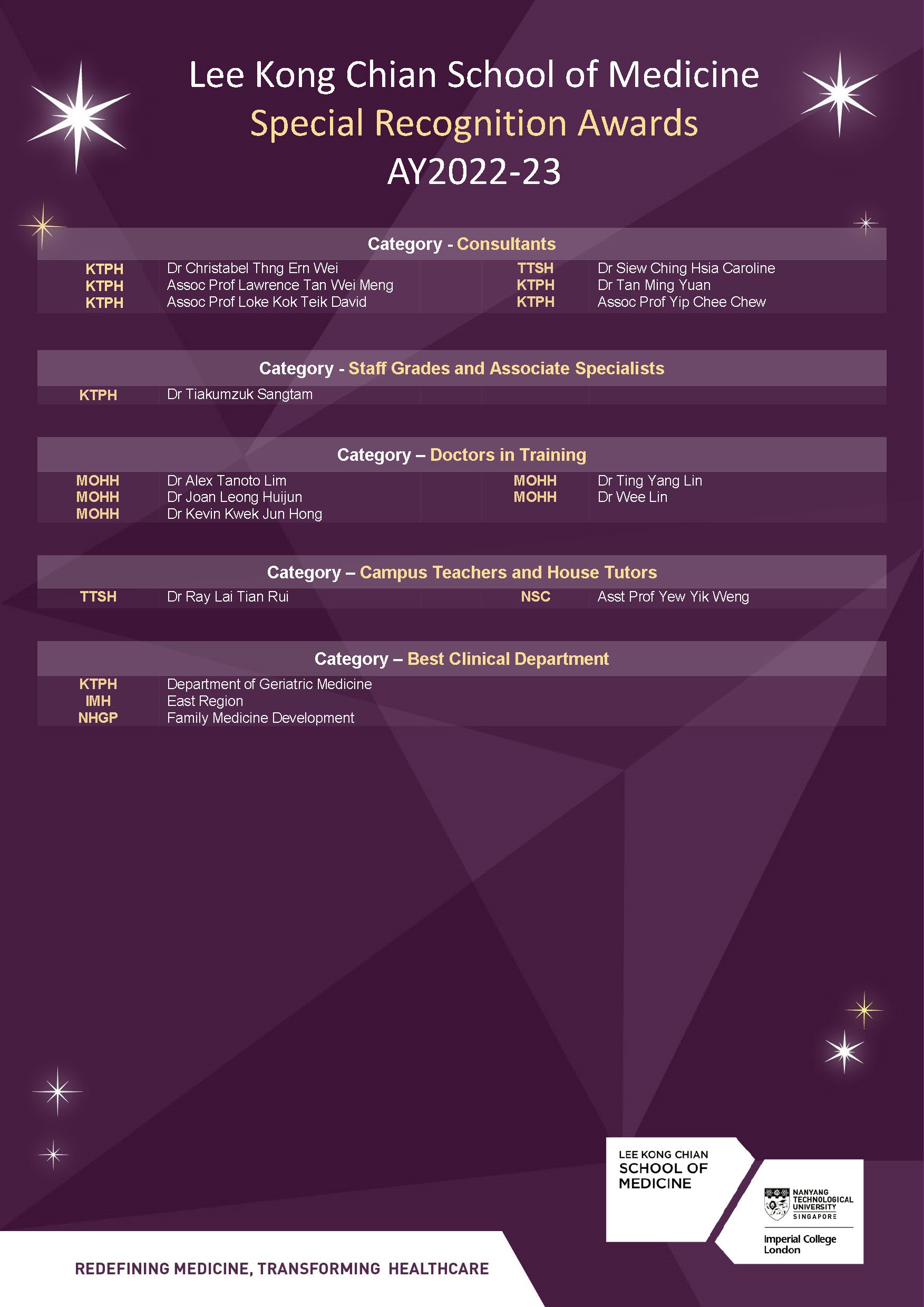 - NHG Teaching Award for Junior Doctors – The award recognises outstanding medical residents (PGY2 & above), medical officers, family physicians, resident physicians and registrars who are involved in teaching students, new recruits and/or junior staff.