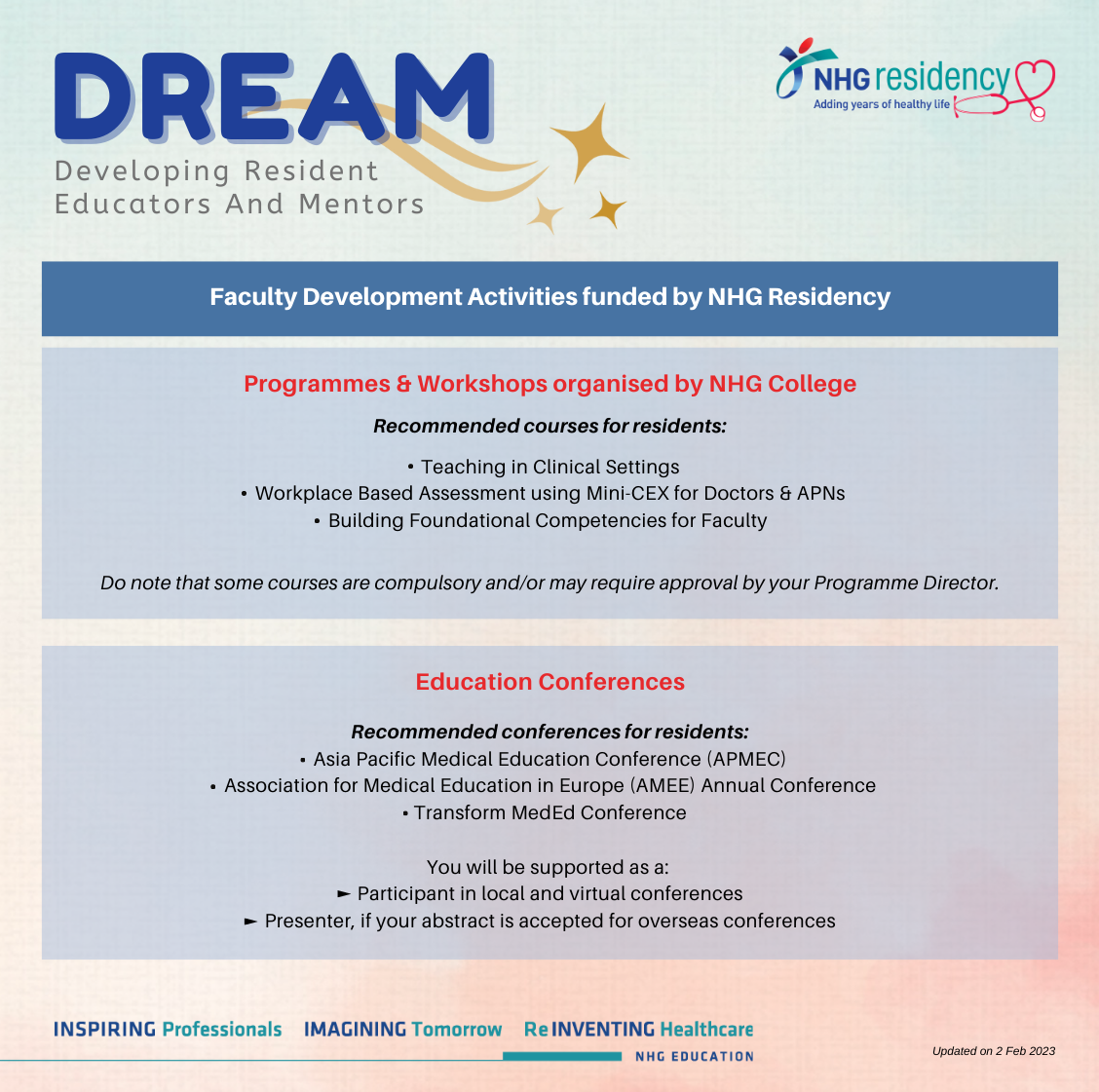 To facilitate your development in clinical teaching and mentoring, we provide funding support for you to attend faculty development activities such as programmes, workshops, and education conferences, through our DREAM (Developing Resident Educators and Mentors) programme.
