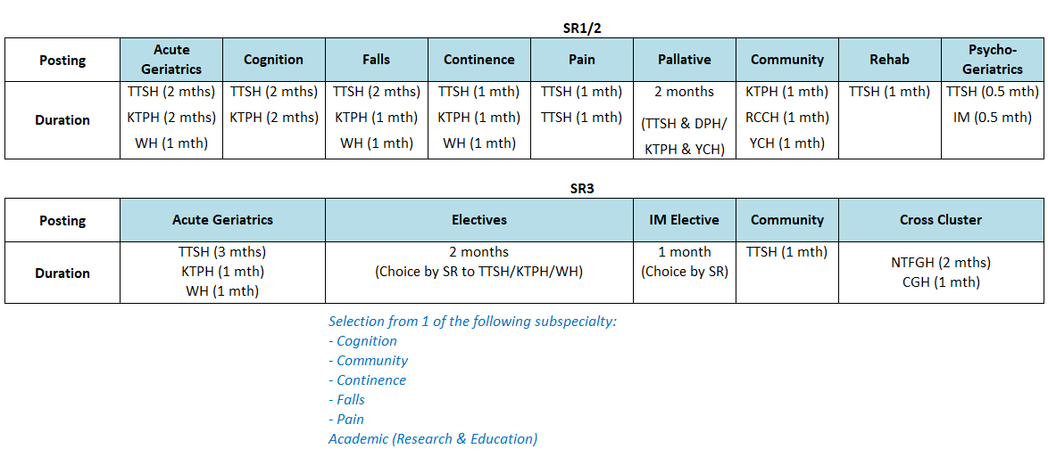 The NHG Geriatric Medicine Residency Programme is a 3-year training programme. In the first 2 years, the senior resident will complete compulsory core postings that grant them the skills and knowledge to function as a Geriatric Consultant in different settings of care. The final year of training further develops the resident's competency in geriatric care and allows them to explore specific fields of interest such as models of geriatric care, community geriatrics, research, and geriatric syndromes such as falls, incontinence, and dementia. Upon completion of the 3-year programme, the resident will achieve an accreditation by the Singapore Specialist Accreditation Board and become certified as a specialist in Geriatric Medicine.