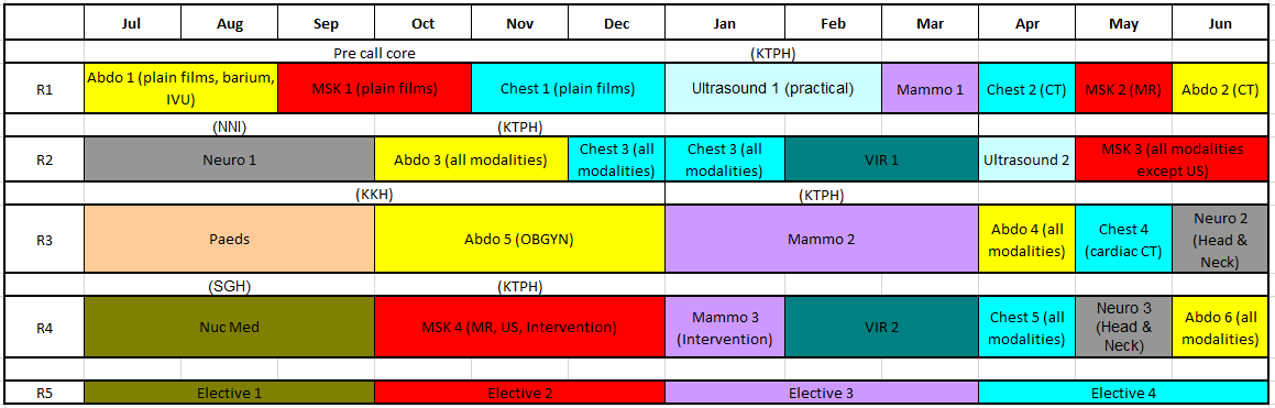 The R1 year is further divided into two distinct halves. In the first half, the resident learns basic plain film interpretation as well as how to perform barium and Intravenous Urogram (IVU) studies. He/she also learns some basic procedures such as Peripherally Inserted Central Catheters (PICCs) insertion, lumbar puncture, and insertion of naso-gastric and naso-jejunal tubes under fluoroscopic guidance. The second half of R1 is a short introduction to advanced modalities such as CT, MR, and Mammography as well as practical coaching in basic Ultrasonography.