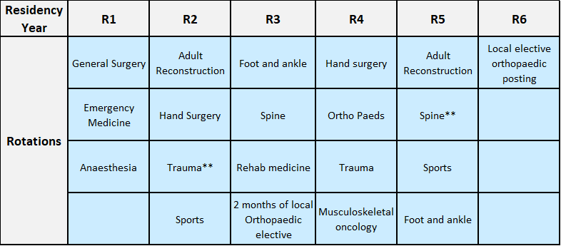 In the first year of residency, the resident begins with foundational development in the principles of surgery. During this period, he/she rotates through the department of Accident and Emergency, General Surgery, and Anaesthesia, building on core surgical knowledge before starting on formal orthopaedic training.