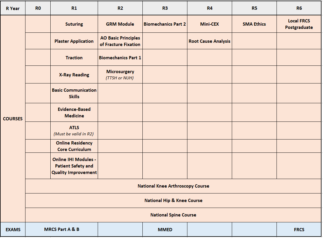 After successful completion of our structured 6-year programme, all residents will sit for the FRCS(Tr&Ortho) exam by the Royal College of Surgeons(Edinburgh). This is a major requirement for achieving specialist accreditation to practise orthopaedics in Singapore.
