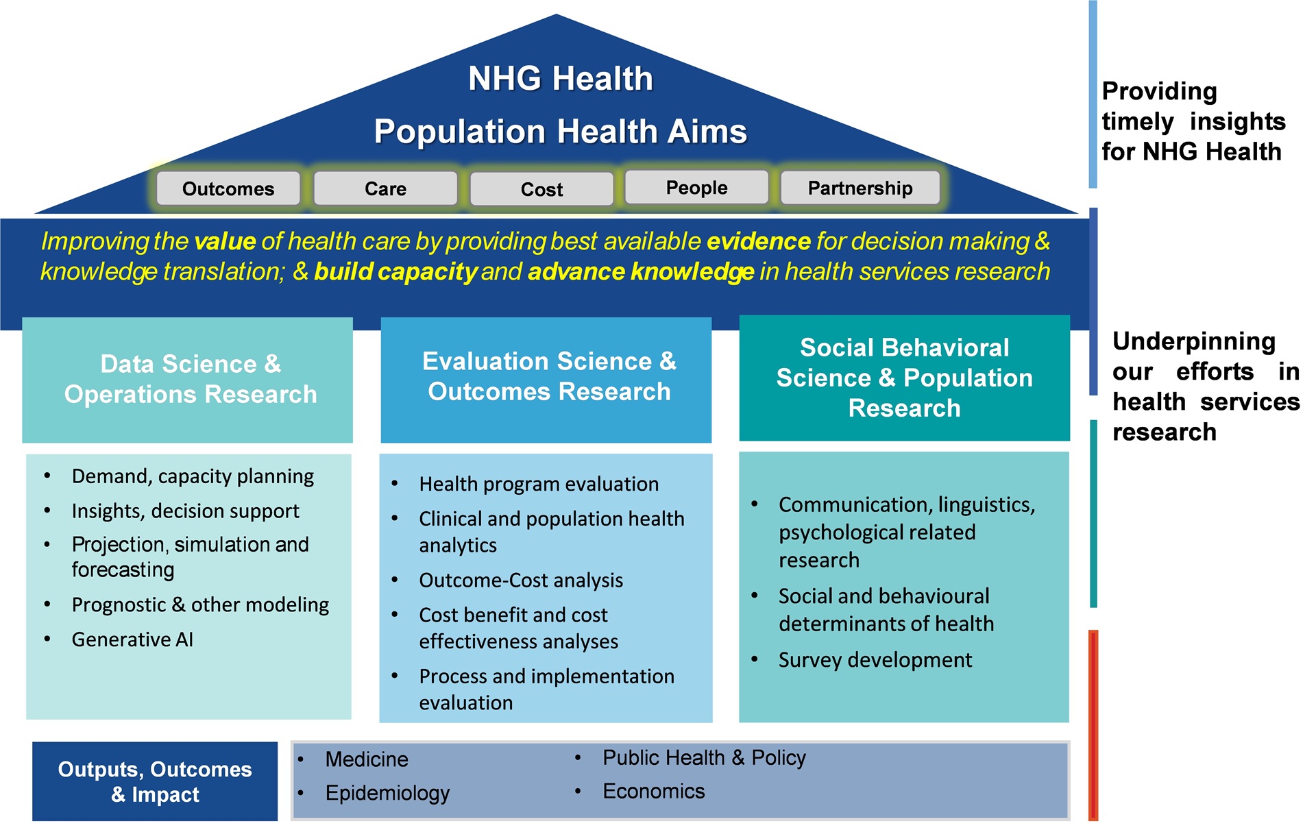HSOR provides “the evidence behind your decisions”. Started in Sep 2005, our portfolio and scope of work have grown considerably since. Our work is translational in nature, at the intersection of research and policy; addressing how health care including how it is delivered, social factors, behaviours, and payment models, affect access, quality and cost of health care, and ultimately our health and well-being. Our multidisciplinary team consists of experts in various disciplines, including medicine, nursing, physio/occupational therapy, epidemiology and public health, qualitative research, biostatistics, data science, informatics, mathematics, operations research, industrial engineering, health economics, psychology and social science. Our department is inherently user-driven, focusing on the needs of health policy makers and clinical stakeholders, enabling them to make the most informed decisions possible. With input from our collaborator-stakeholders, our research is current, timely and with a direct practical application. Our broad functions are to support NHG in: