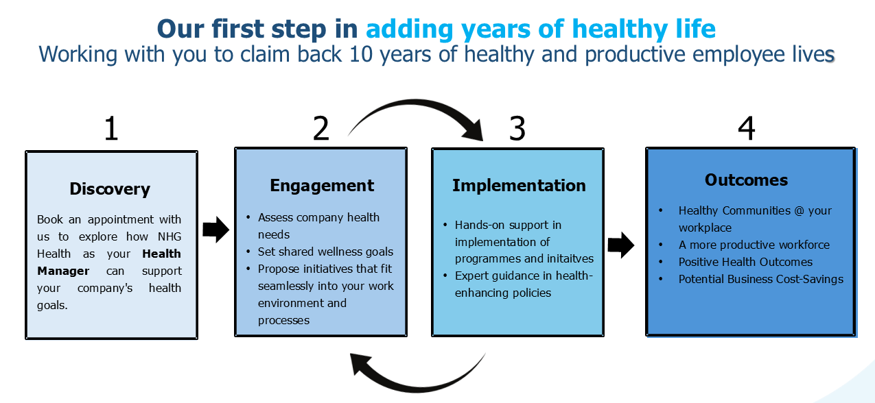 From expert guidance on health-enhancing policies to ongoing programme optimisation, our partnership ensures long-term impact, scalability, alignment with Healthier SG priorities and reduction in long-term health costs.