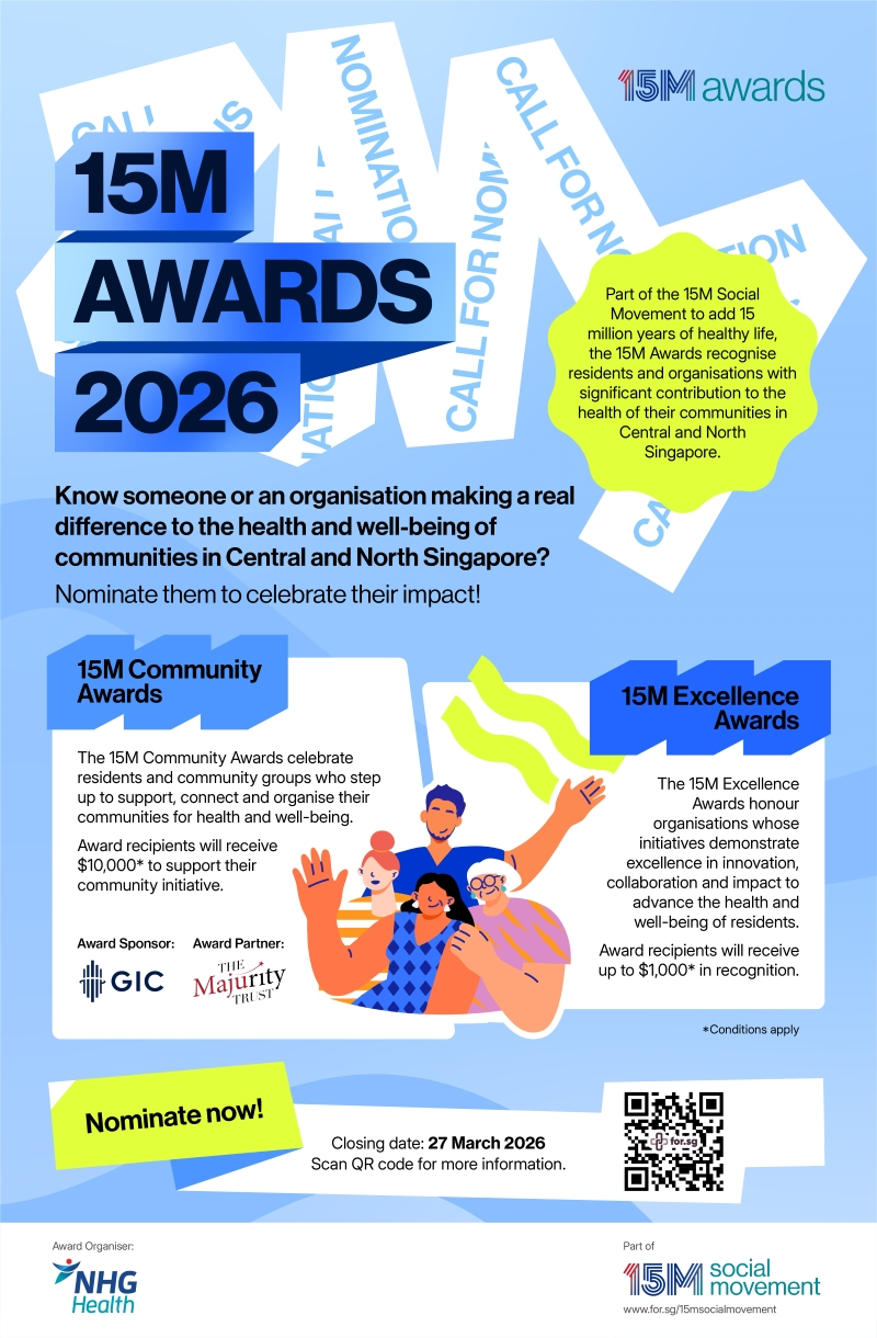 The 15M Community Awards celebrate residents and community groups who step up to support, connect and organise their communities for health and well-being, benefitting residents in the NHG Health region in Central and North Singapore (Sembawang, Ang Mo Kio, Yishun, Mandai, Serangoon, Toa Payoh, Kallang, Geylang, Woodlands, Bishan, Hougang, and Novena).